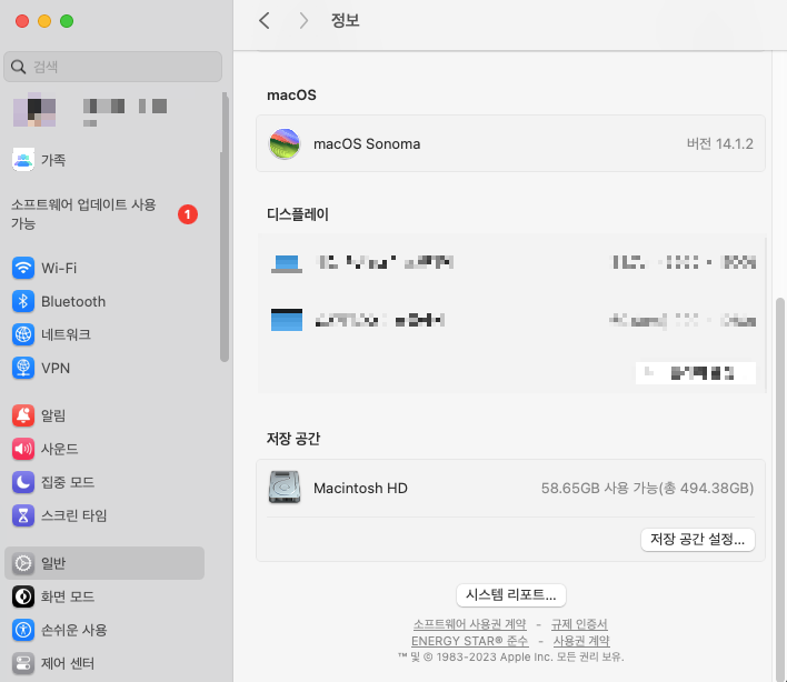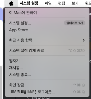 1. 맨왼쪽 위 사과버튼 클릭후 이 Mac에 관하여 클릭